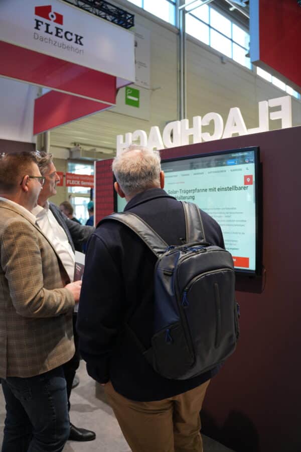 Messebesucher informieren sich über die Solar-Trägerpfanne mit einstellbarer VA-Halterung – direkt am FLECK-Messestand auf der DACH + HOLZ 2026.