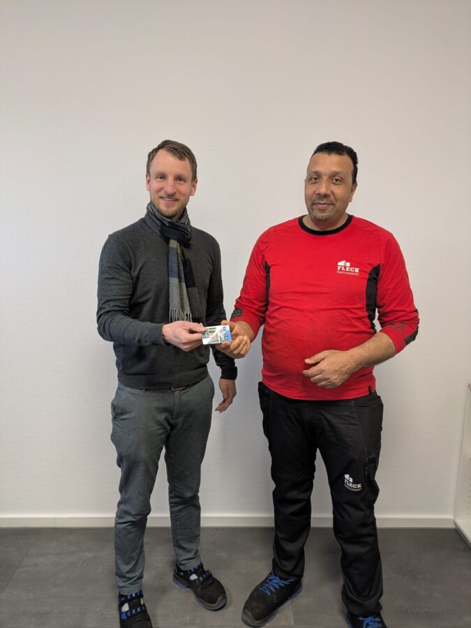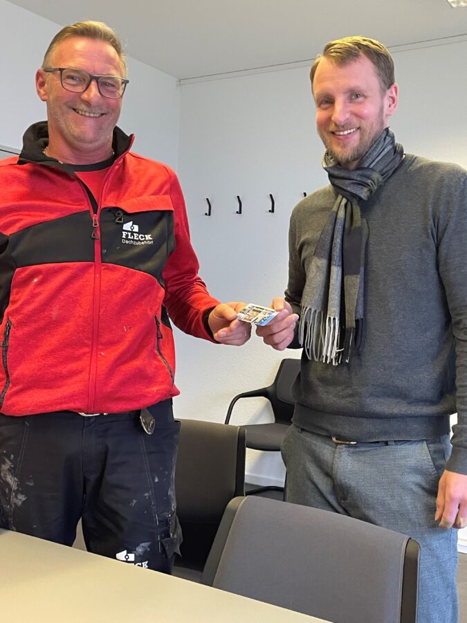 Fabian Ewald (r.) auf Übergabe-Tour: Auch Klaus Pscholka (l.) nimmt den Tankgutschein im Wert von 150,00 Euro gerne entgegen.